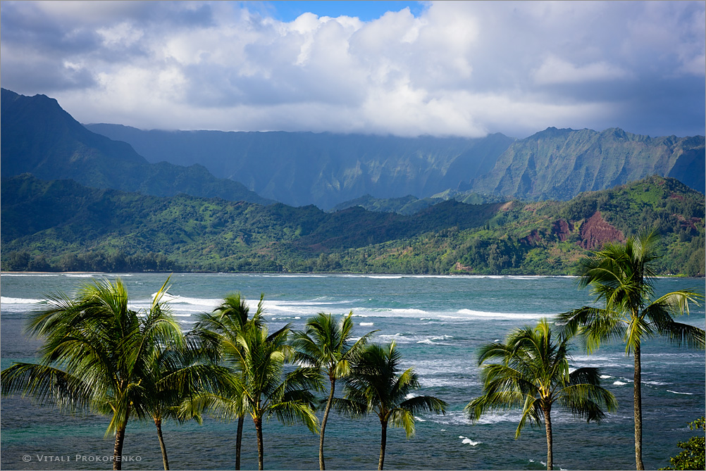 The day started as any other Hawaiian day. The sky was cloudy at the northeast end of Kauai just as any other day of the last vacation. My first look out of the window at the clouds, palm trees, the ocean, beach, and mountains in the distance. Hey, there in the mountains something interesting was going on. The sun broke through the clouds and lit up one of the mountains in the ridge.