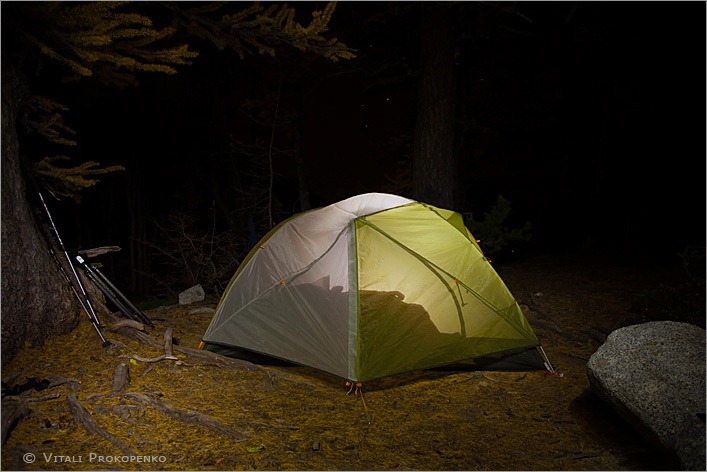 Midday light was steep and harsh with clear sky. The previous day we spent midday resting. The last day before heading back I went back to the area between Leprechaun Lake and Perfection Lake. The day before I liked the stream and a line of larch needles along it but in afternoon light it was cut in half by a shadow of a mountain on the left. So, I returned there midday to avoid any shadows.
